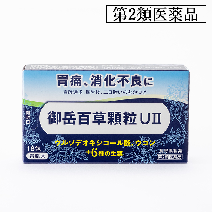 年末に大活躍!御岳百草顆粒UⅡは、6つの生薬とダブルのU(ウコン、ウルソデオキシコール酸)を配合した胃腸薬で、制酸作用を有し、胸やけ、胃酸過多、胃弱、消化不良、食欲不振、二日酔・悪酔いのむかつきなどを改善します。